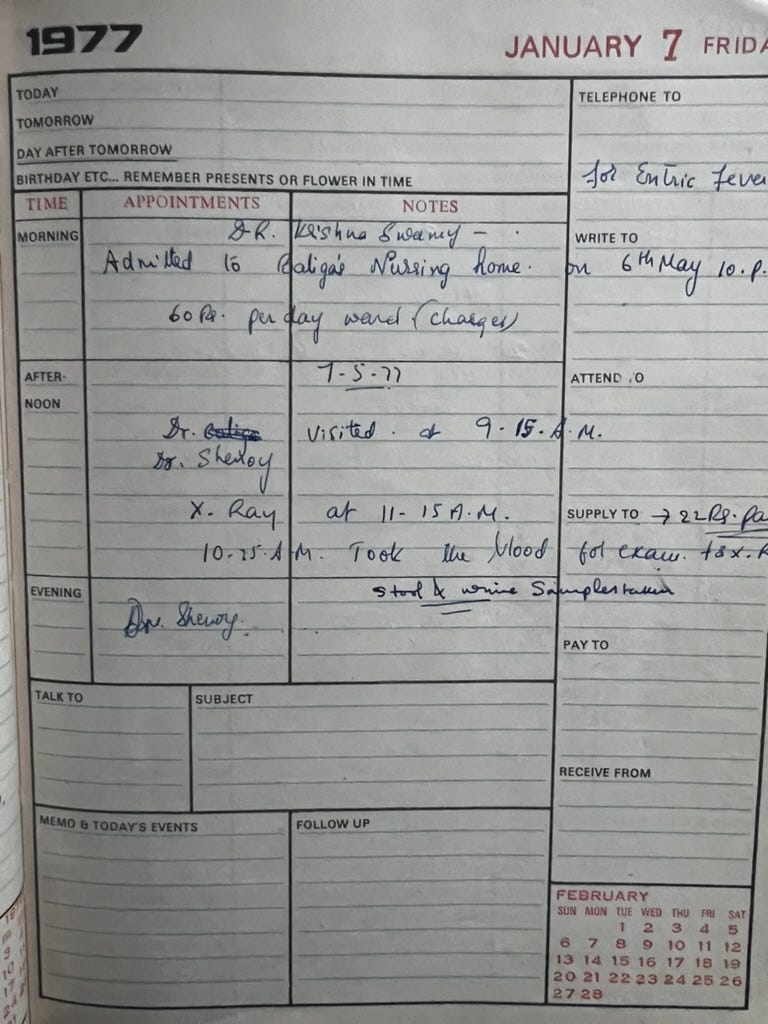 Last week, my brother handed over an old diary belonging to my father. An entry from 1977 by my mother stopped us both in our tracks. My father was admitted to a hospital in Goregaon, Bombay for what eventually turned out to be typhoid. My brother recalled that a friend’s father accompanied him to the junior college (Parle college) to get admission since dad was indisposed.